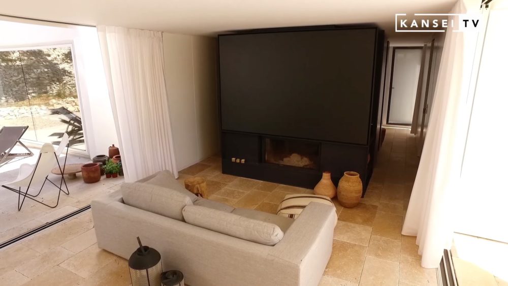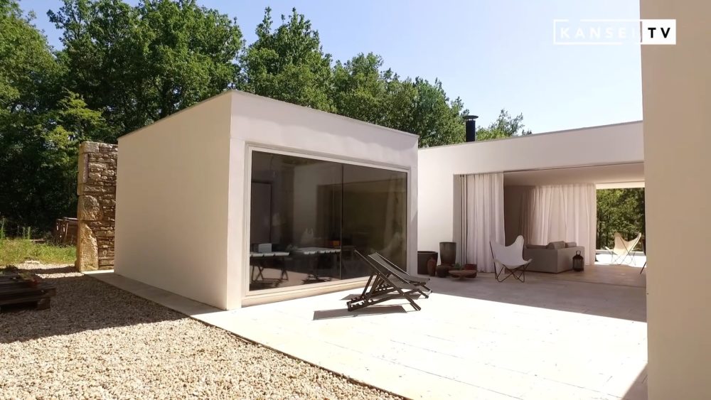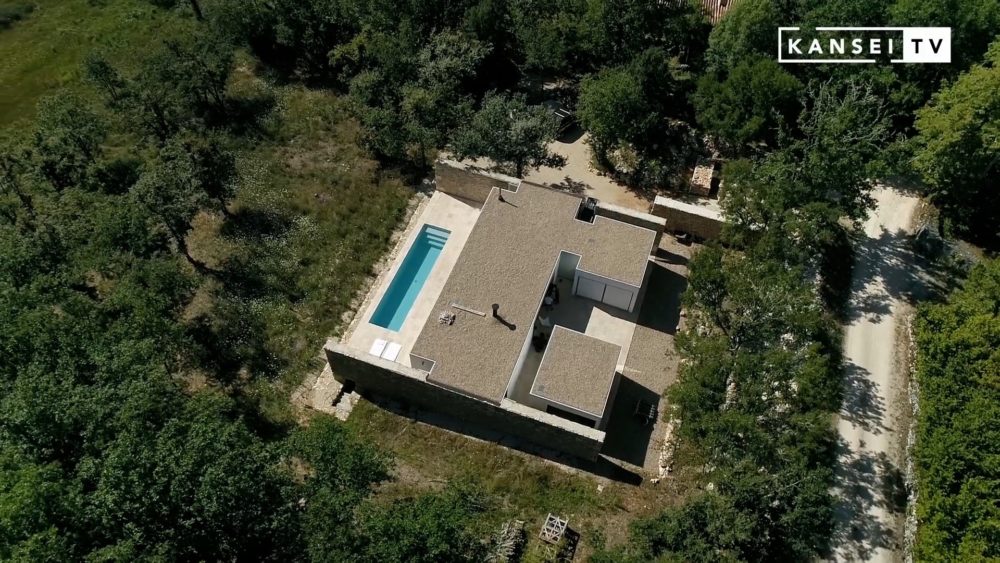 Dans cette région où la pierre est de tradition, il commence par dessiner de grands murs en béton qui délimitent la maison. Puis, en prenant le temps de la réflexion, il les bâtit finalement en pierre.