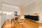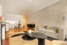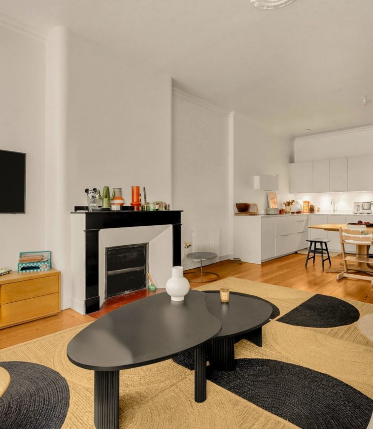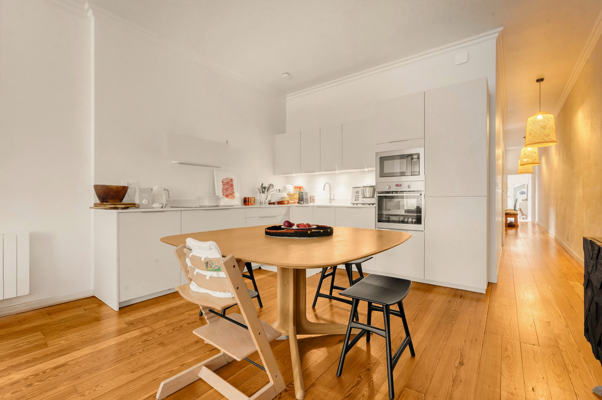 Il se compose d’un vaste séjour lumineux, doté d’une cheminée et d’un parquet d’origine, ouvert sur une cuisine américaine moderne et entièrement équipée, créant un espace de vie convivial et chaleureux. La décoration sobre et raffinée contribue à l’harmonie de l’ensemble.