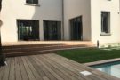 Une cuisine moderne avec une immense baie vitrée permet d'accéder à la terrasse et offre une perspective extrêmement moderne à