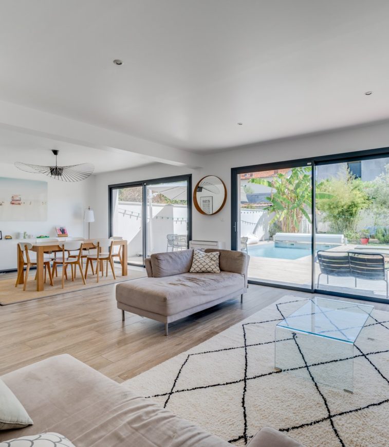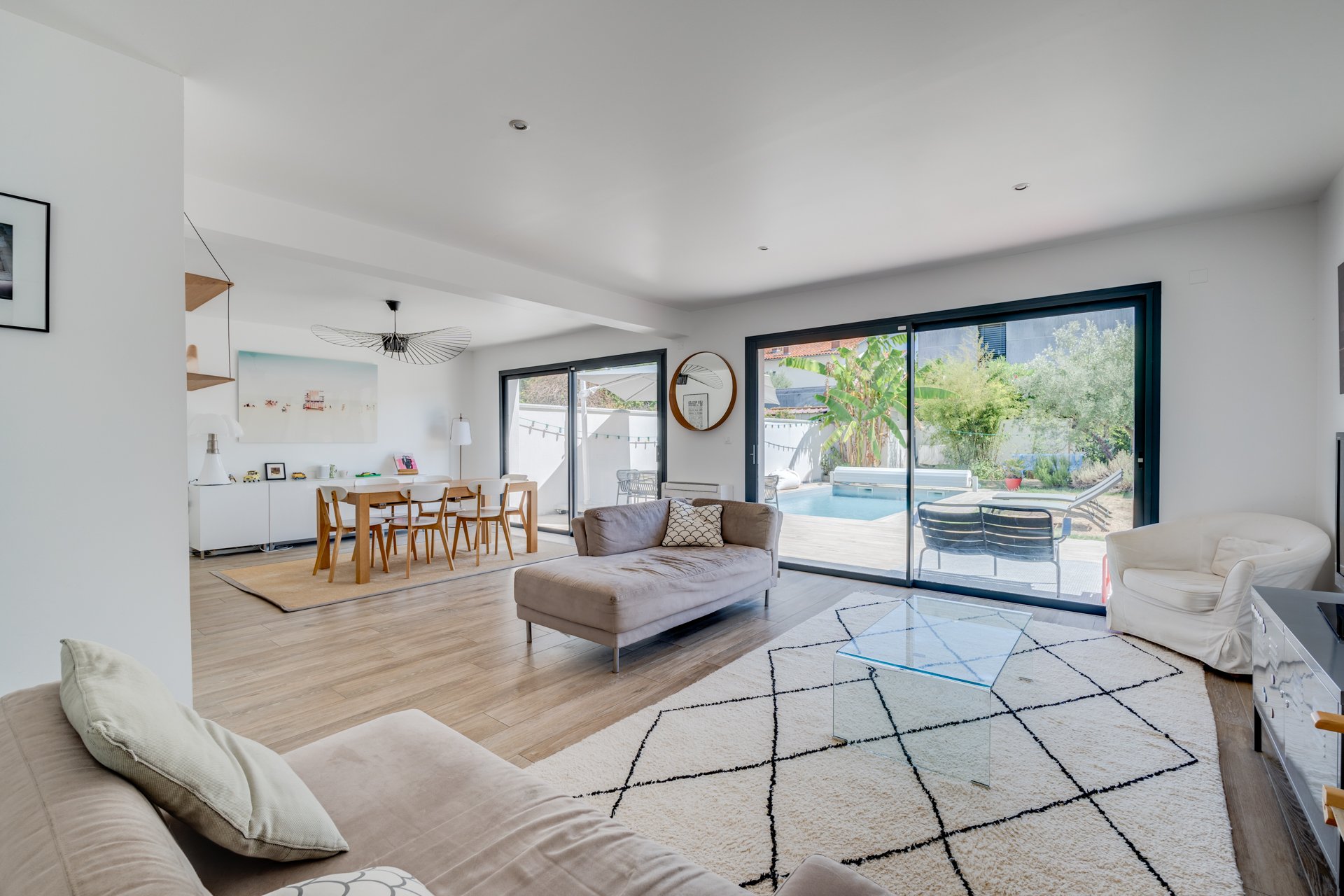 Fluide, spacieuse la pièce de vie se prolonge sur un jardin épuré avec piscine chauffée.