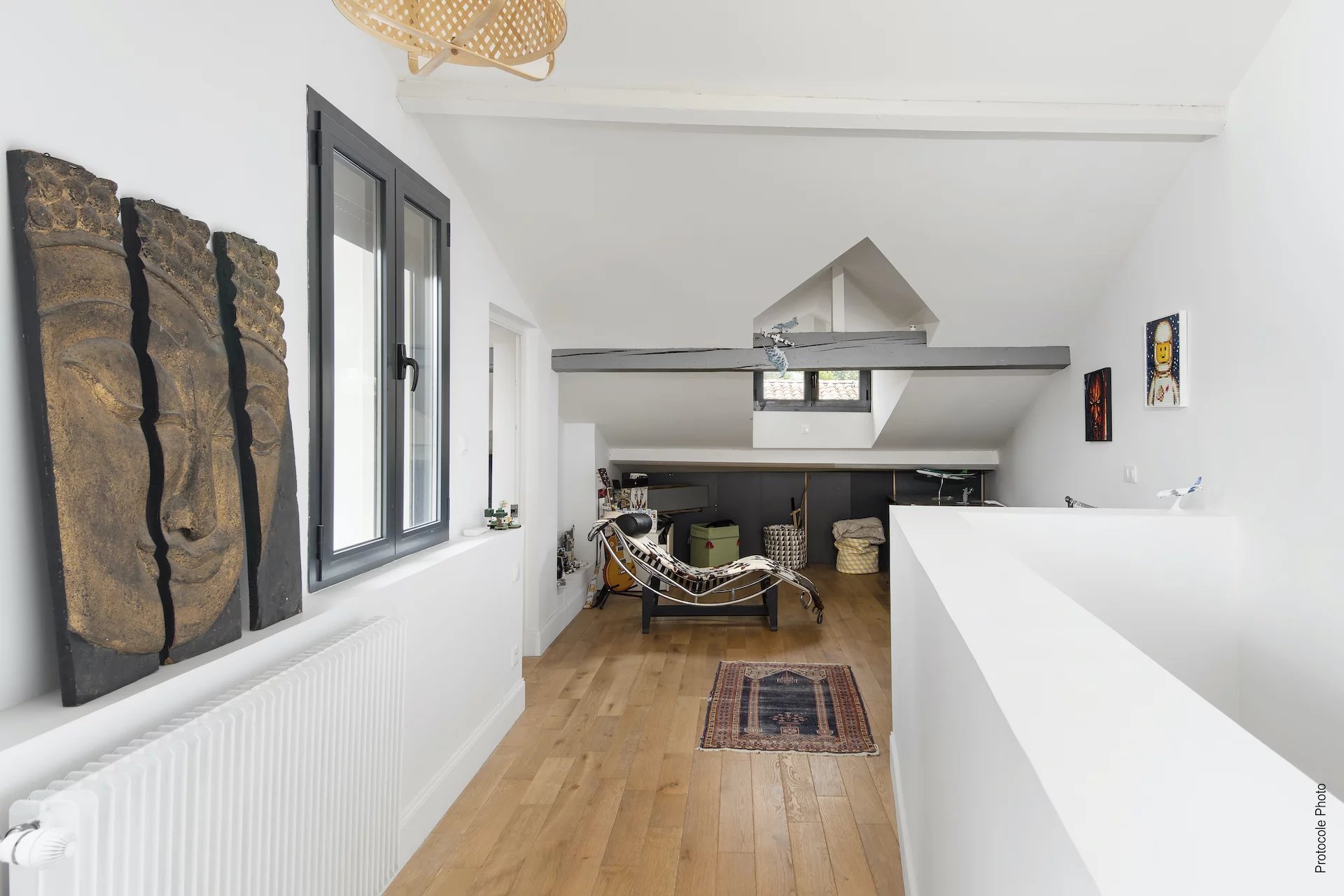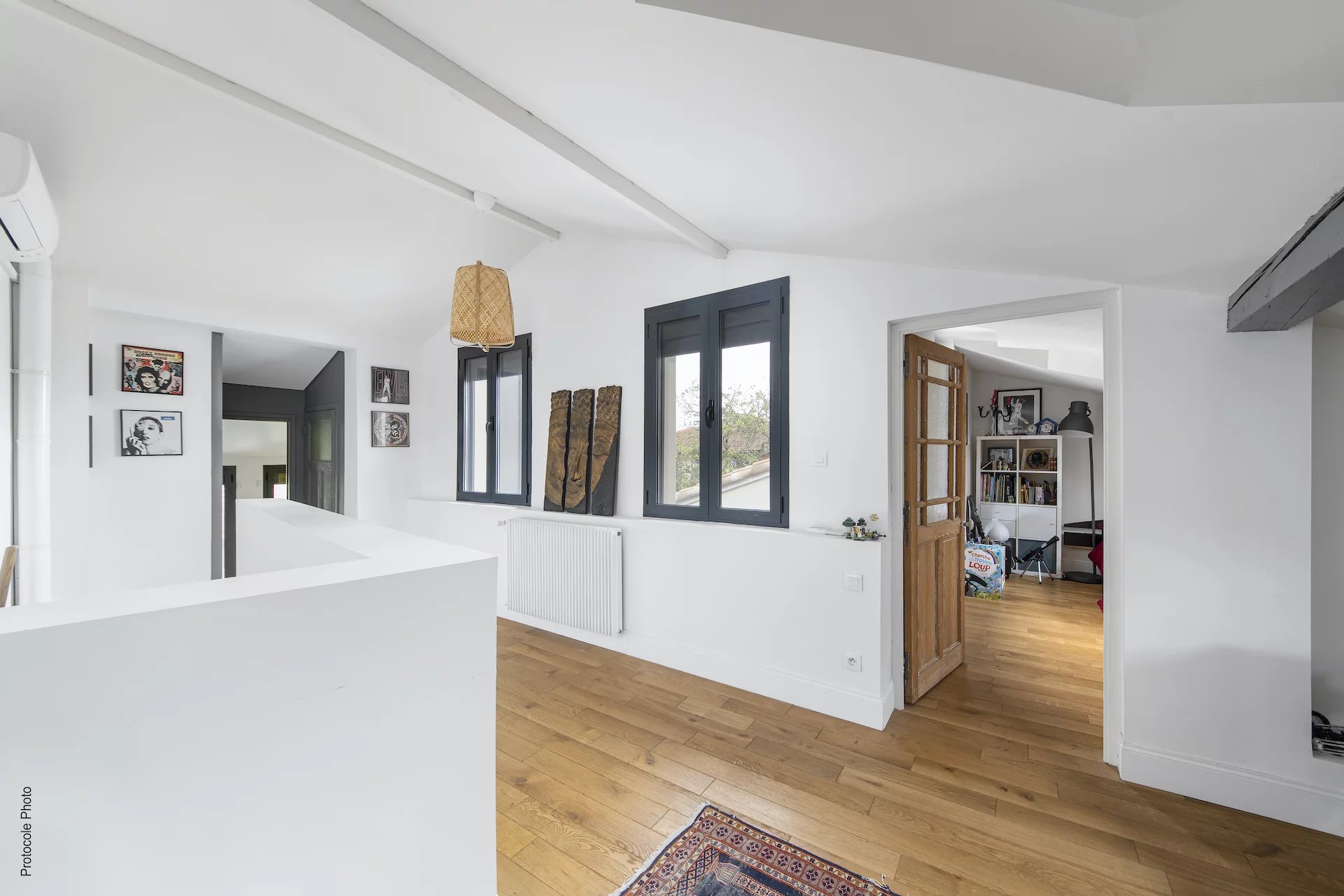 Cette rénovation contemporaine d'envergure apporte une cohérence esthétique à l'ensemble, ouvrant les espaces et créant des transparences tout en conservant les éléments de caractère. Le résultat est une métamorphose réussie permettant de profiter d'une très agréable maison T5 de 154m² habitables et plus de 180m² au sol.
