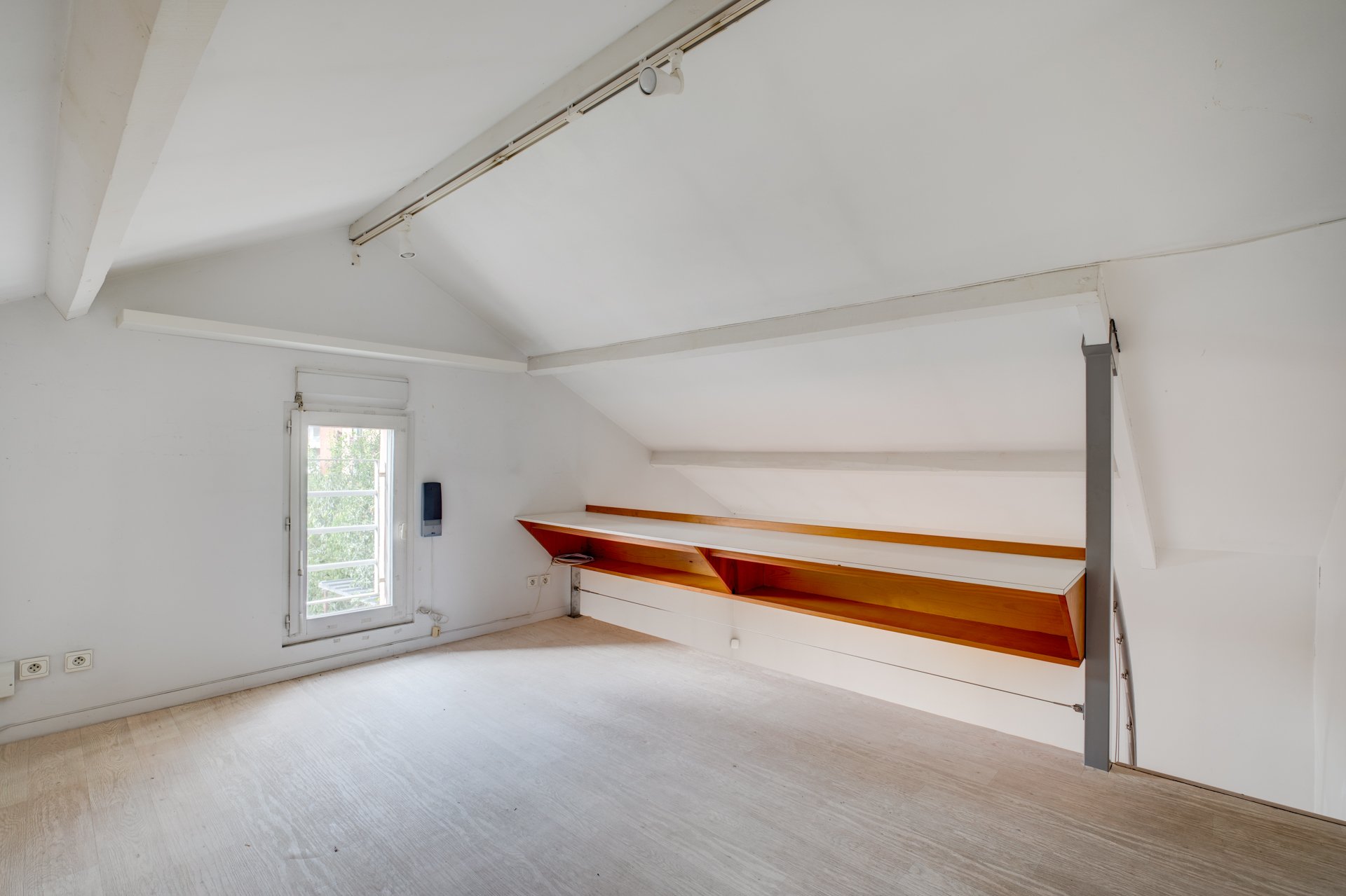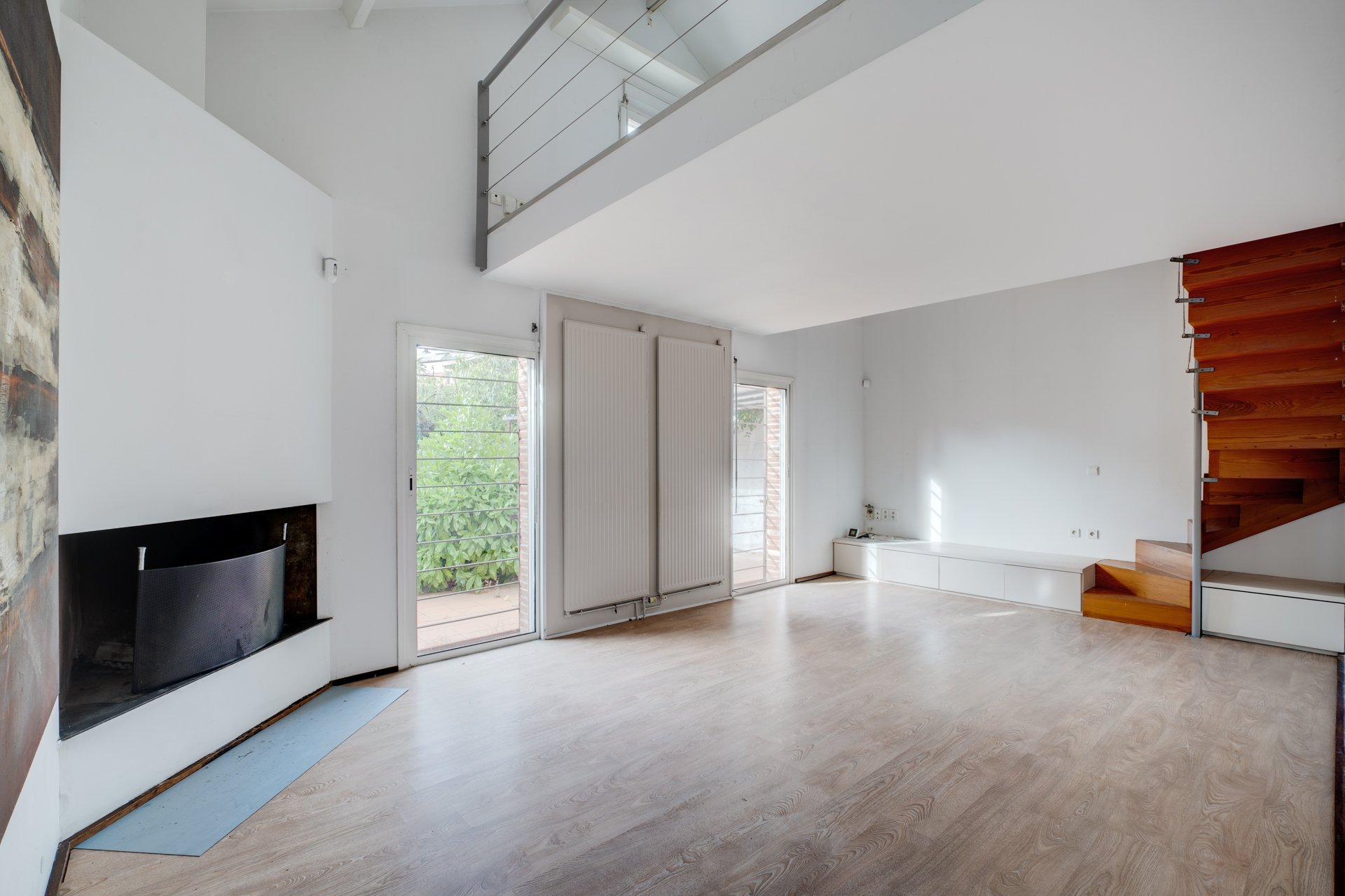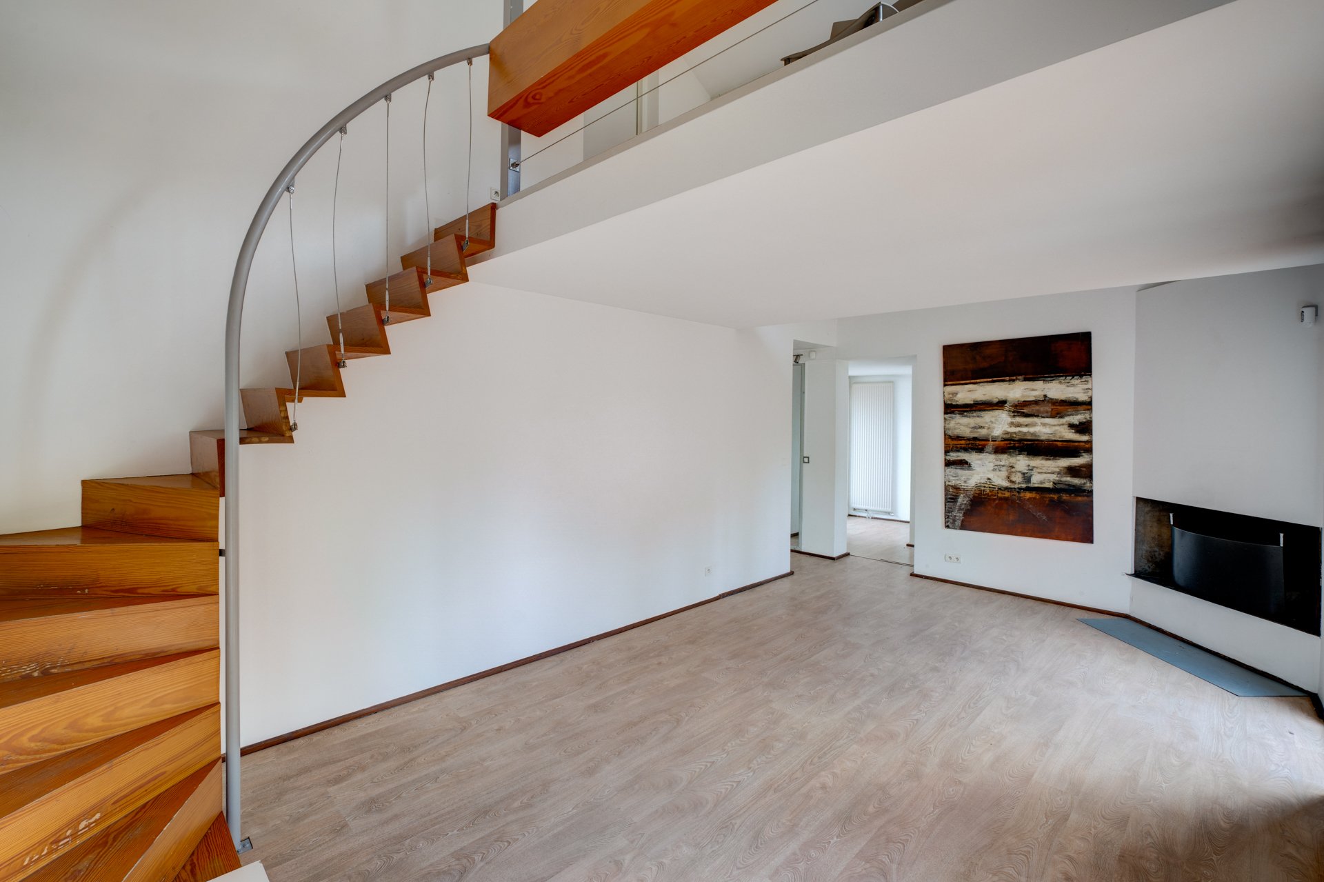 Élément décoratif essentiel du séjour, un escalier en bois mène à l’étage supérieur comprenant un bureau indépendant et une chambre attenante.
